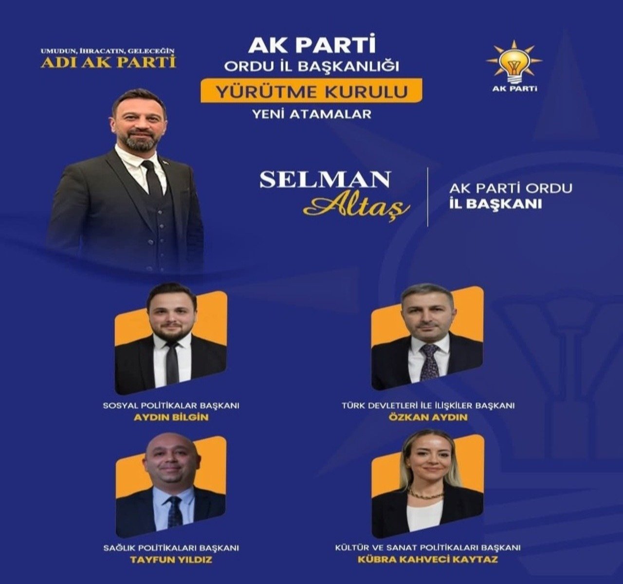 Kısa süre önce AK Parti Genel Merkez Teşkilat Başkanlığı , ihdas edilen yeni yürütme kurulu birim başkanlıklarını duyurmuştu.AK Parti Ordu İl Başkanlığı olarak yeni birim başkanlıklarına görevlendirmeleri yaptı.